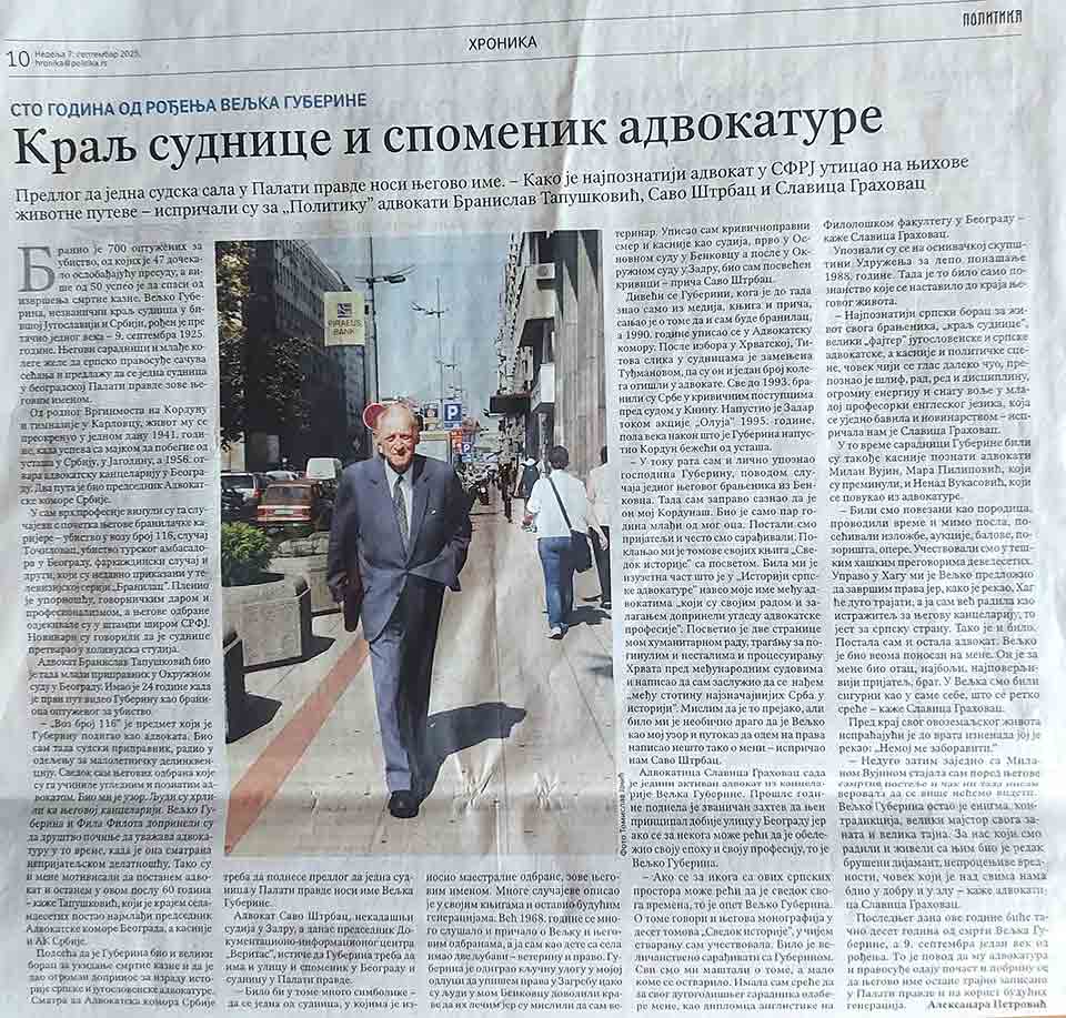 Poslednjeg dana ove godine biće tačno deset godina od smrti Veljka Guberine, a 9. septembra jedan vek od rođenja. To je povod da mu advokatura i pravosuđe odaju počast i pobrinu se da njegovo ime ostane trajno zapisano u Palati pravde i na korist budućih generacija.