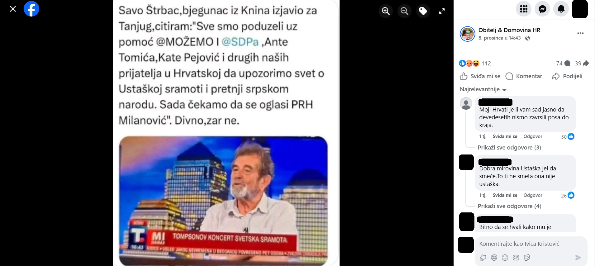 “Savo Štrbac, bjegunac iz Knina, izjavio za Tanjug, citiram: Sve smo poduzeli uz pomoć Možemo i SDP-a, Ante Tomića, Kate Pejović i drugih naših prijatelja u Hrvatskoj da upozorimo svijet o ustaškoj sramoti i prijetnji srpskom narodu. Sad čekamo da se oglasi PRH Milanović. Divno zar ne”.