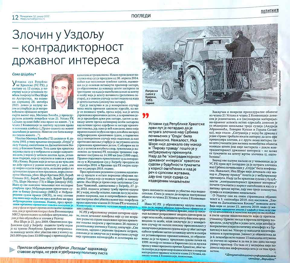 Уставни суд Републике Хрватске први пут је потврдио да је истрага злочина над Србима почињених у ‘Олуји’ била неефикасна. Нажалост, Ика Шаре није дочекала ову макар и ‘Пирову правду’ пошто је у међувремену преминула.