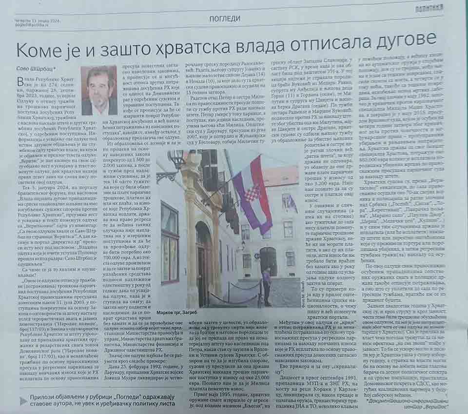 Tek 5. januara 2024. na portalu braniteljskog foruma, pod naslovom “Vlada oprašta dugove pripadnicima srpske nacionalne manjine na ime izgubljenih sudskih sporova protiv Republike Hrvatske” preuzima vest o usvajanju i tekst pomenute odluke sa “Veritasovog” sajta uz komentar: “Sa ovom odlukom hvali se Savo Štrbac na stranici ‘Veritasa’”. A dan kasnije i portal “direktno.hr” prenosi istu vest pod naslovom: “Vladina odluka koja je očiti ustupak Pupovcu prošla ispod radara: Savo Štrbac je oduševljen.”