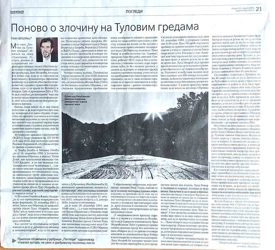 Мој текст “Злочин на Туловим гредама“, објављен на овим страницама 31. марта, изазвао је поприлично коментара и питања у вези убиства деде познатог хрватског интернационалног фудбалера Луке Модрића, по којем је и добио име, која су се односила на конастатацију функционера обровачке милиције да је његово убиство последица његове сарадње са хрватским терористима, који су се крили по Велебиту и убијали Србе и припаднике ЈНА и ТО, те да је ухваћен “in flagranti” када им је носио храну и преносио информације, због чега се не може ни сматрати цивилном жртвом.