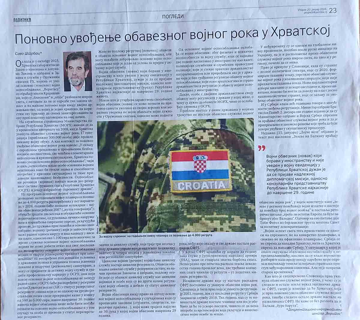 Od kad je u oktobru 2025. Hrvatski sabor izglasao Zakon o izmenama i dopunama Zakona o odbrani i Zakona o službi u Oružanim snagama RH, kojima se uvodi osnovno (temeljno) vojno osposobljavanje, “Veritasu” se obraćaju mnogi Krajišnici, koje su “bljeskovi” i “oluje” razbacali širom sveta, sa pitanjem da li se odredbe tih zakona odnose i na njihove potomke koji imaju dvojno državljanstvo, od kojih je jedno hrvatsko, pa koristim ovu priliku da svima zainteresovanim za ovu problematiku odgovorim na ovaj način.